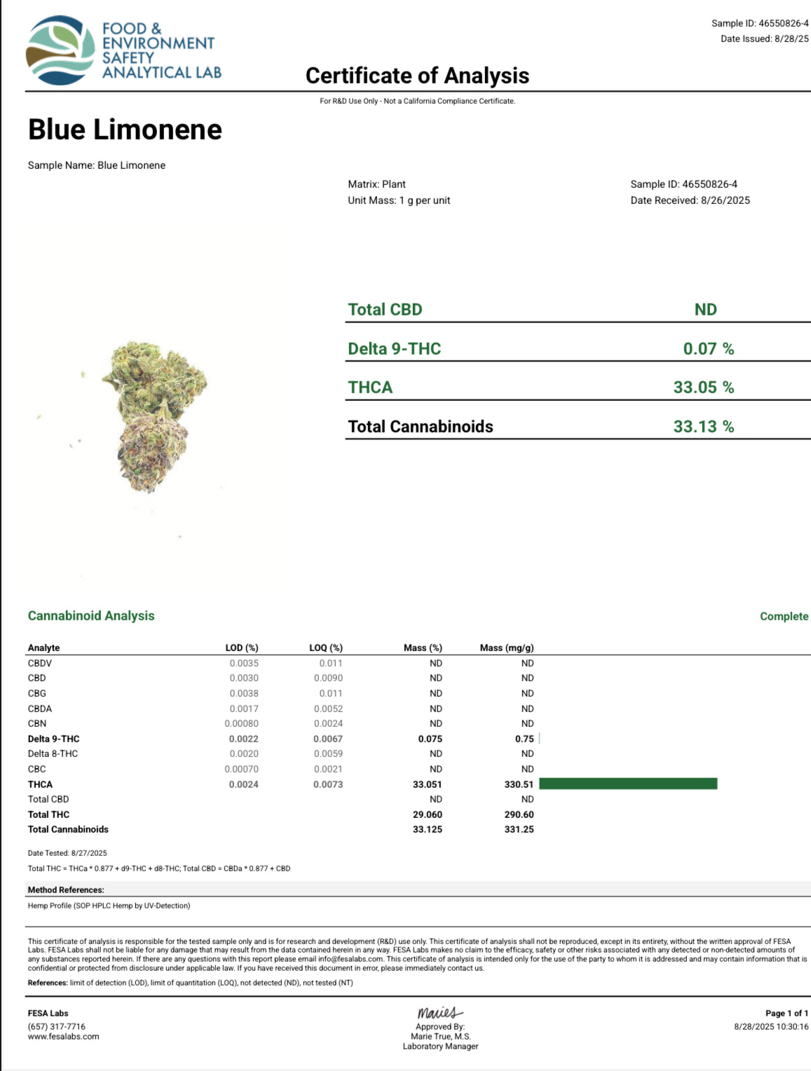 - Total THCA: 33.05%+ (batch dependent)