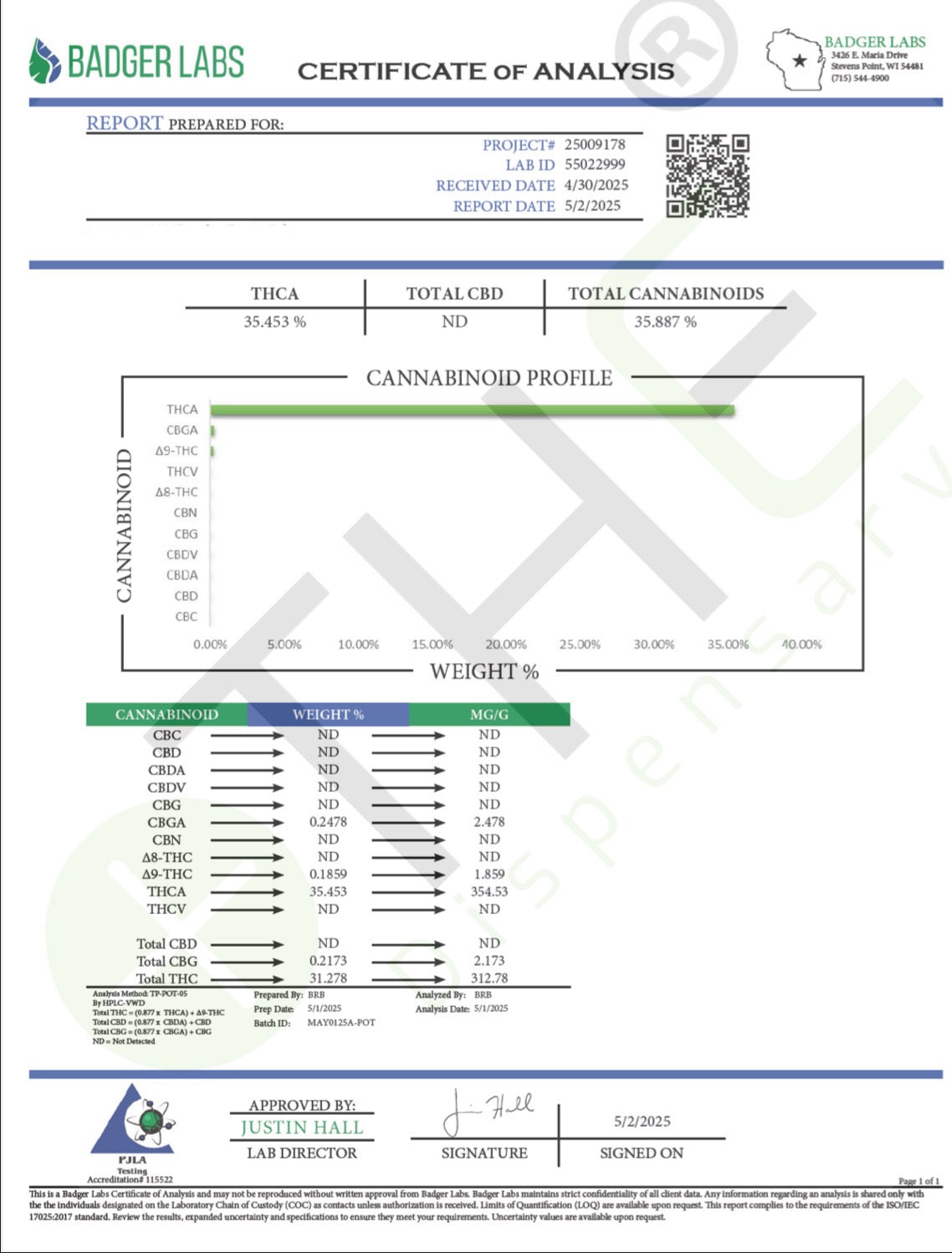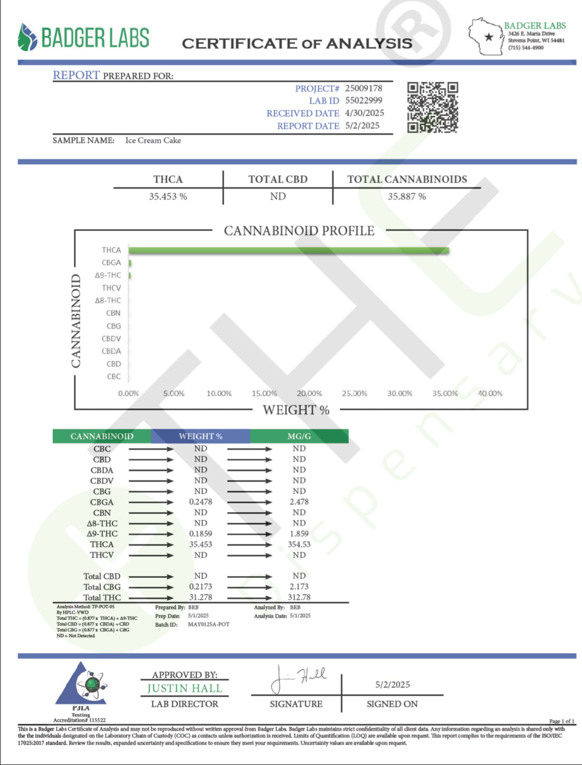Ice Cream Fruity Pebbles, also known as Fruity Pebbles Ice Cream, is a balanced hybrid cannabis strain celebrated for its sweet, cereal-like flavors and versatile effects. This particular batch features an exceptionally high THCa content of 35.45%, making it a powerhouse for users seeking intense therapeutic or recreational benefits once decarboxylated into THC.
