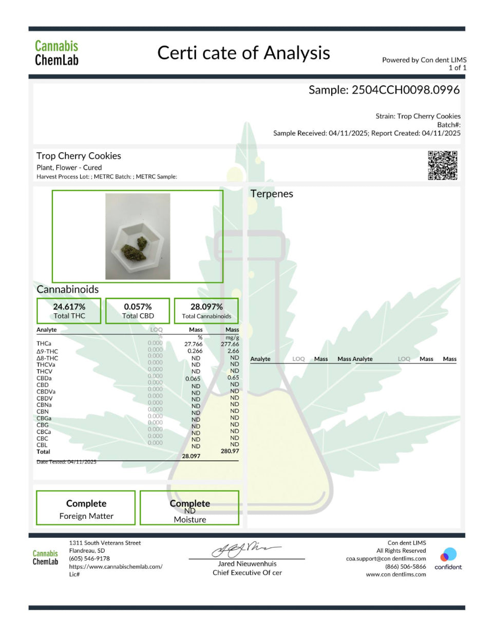 Trop Cherry, also known as Tropicana Cherry, is a sativa-dominant hybrid cannabis strain celebrated for its vibrant tropical flavors and uplifting effects. This particular batch boasts a potent THCa content of 27.76%, offering strong potential for therapeutic or recreational use once decarboxylated into THC.